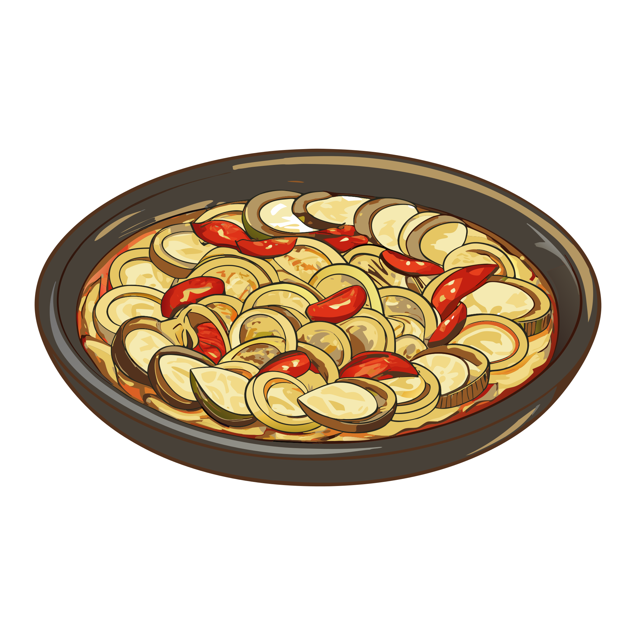 Pisto (vegetable stew) is part of Spanish kitchen — regional dish icons. Tapas, rice dishes, and regional Spanish classics in one illustrated set.